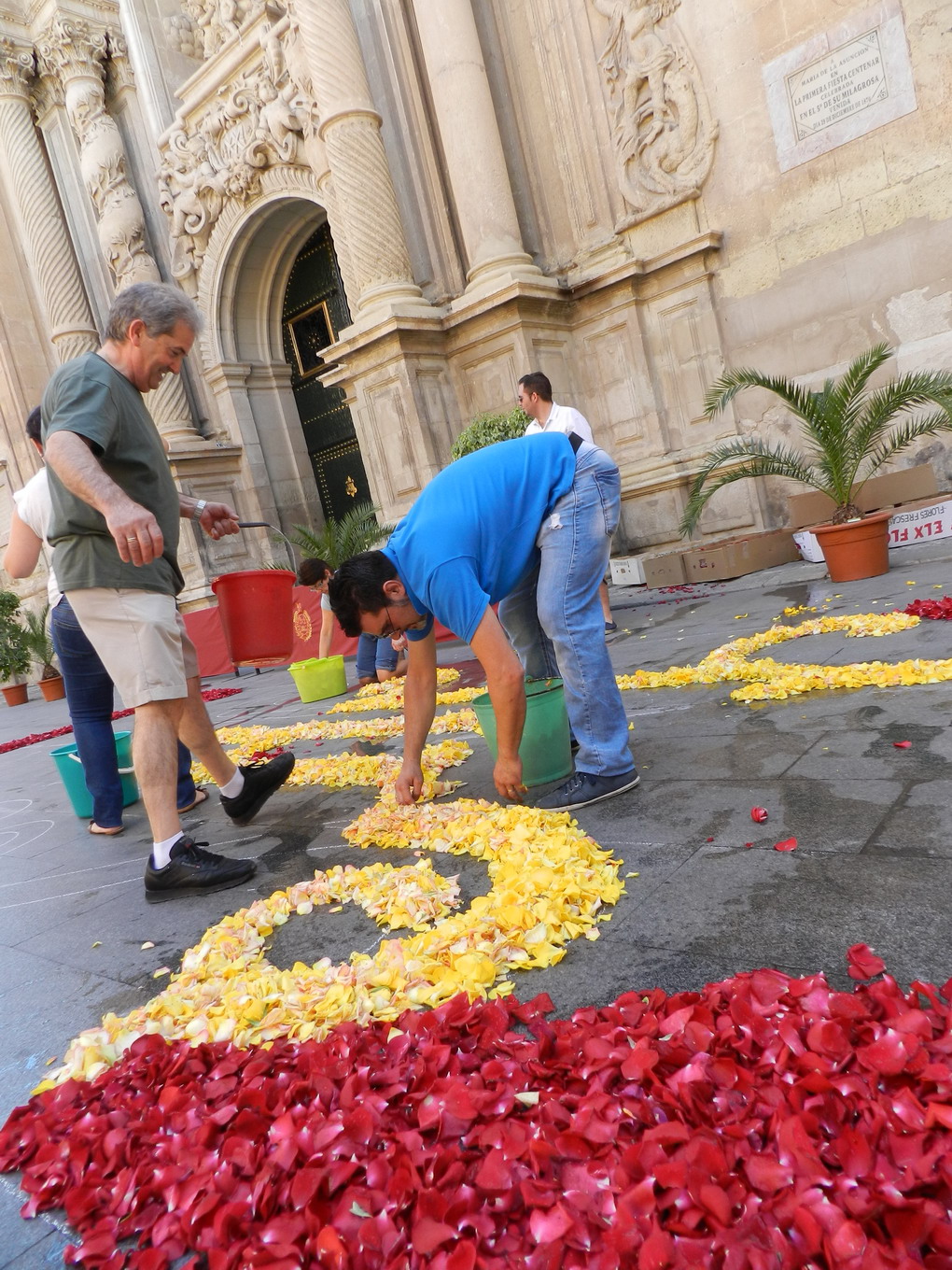 En la puerta principal de la Basílica veo de rodillas a un grupo de amigos de la fe y de la tradición poniendo artesanalmente con manos que son pétalos de flores rojas y amarillas, gualdas de la bandera de España, para formar geométricas figuras. Este grupo atrajo mi atención he hice una docena de fotos y un autorretrato para situarme. En frente el grupo escultórico de peregrinos que anuncian al visitante el camino de Santiago, y por allí pupulaban los fotógrafos ya en carrera de inolvidable maratón fotográfico (se inscribieron cerca de 200).